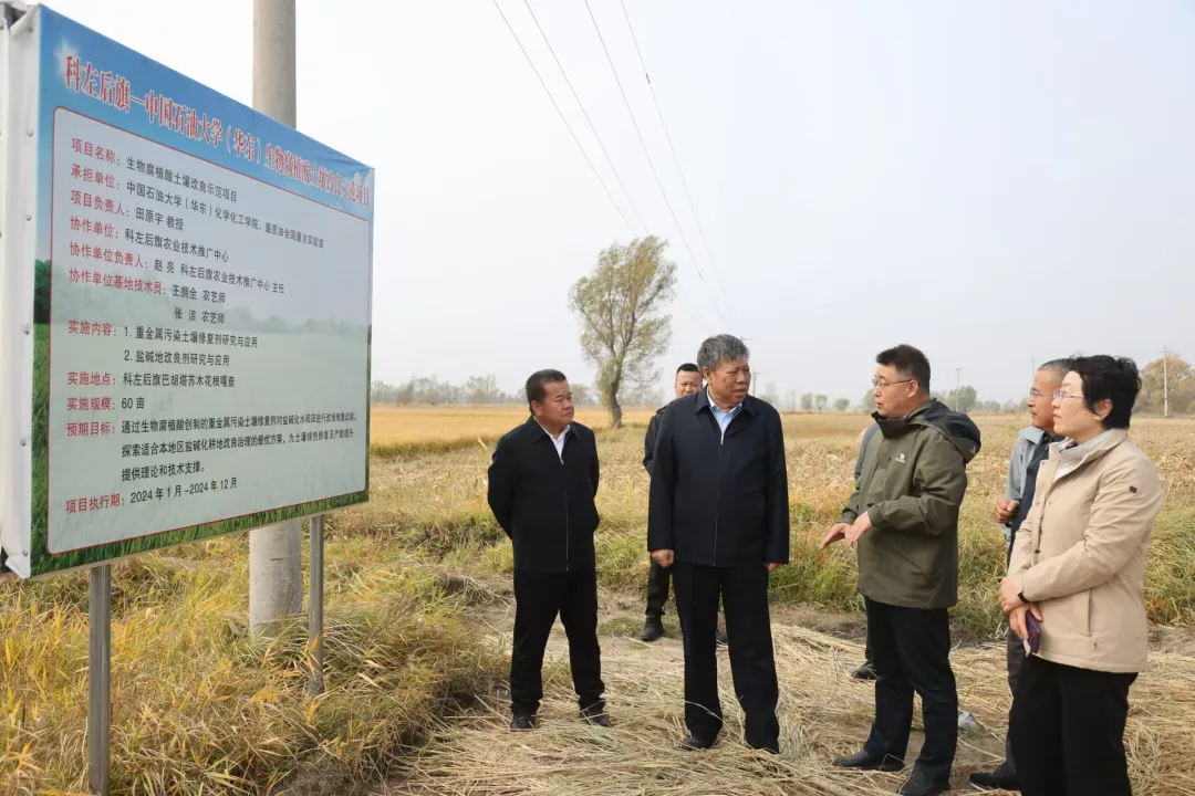 10月14日,校长郝芳院士、副校长张玲玲、科左后旗旗委书记郭天宝一行现场调研“生物腐植酸土壤改良”示范项目,听取了田原宇教授对项目推进、测产、后续试验等汇报。郝芳对示范项目给予高度评价,对项目后续推进提出三点要求,一是要做好改良土壤理化性质与结构检测,加强土地改良性质变化的长期监测;二是要加大宣传和推广力度,让成果更好服务社会;三是要进一步降低使用成本,破解秸秆绿色还田和耕地可持续改良的难题,为加强耕地保护,保障国家粮食安全做出更多贡献。