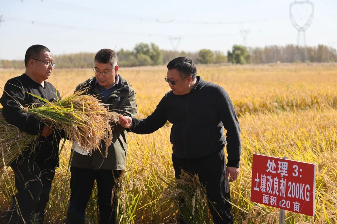 现场经过多点取样、称重、检测和项目组讨论与质询等环节,专家组认为,盐碱地改良和种植水稻实验设计方案合理,增产增收效果明显,亩施用腐植酸土壤改良剂150、200、250公斤,改良后种植水稻,与未施加改良剂的空白对照相比,亩产由302.68公斤分别提高到659.85、650.75、631.69公斤,增产率为118.00%、115.00%、108.70%;与常规施肥对照相比,分别增产17.54%、15.92%、12.52%;改良后对土壤团粒结构、有机质含量等有明显的提升,对土壤的酸碱度具有明显的调节作用,表现出良好的改良效果,可以让盐碱地当年改、当年种、当年有收益。建议进一步降低成本、扩大推广应用面积、并在东北黑土地保护中积极发挥作用。