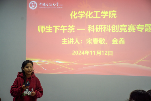 宋春敏就近年来的学科竞赛进行介绍。金鑫以竞赛对于学业的意义入手,建议同学们在大二时候敢于去参加科研竞赛。金鑫以大创为例子分享了科研科创竞赛的经验。他说:“大创比赛是对大学生的一种启蒙,这是一个成长的过程,虽然刚开始确实能做的内容不多,但是你要主动的去学习,不管是学会做ppt还是学会看文献都是一种进步”。宋春敏补充建议同学们要好好学习化工原理,扎实基础,在老师上课之余要学会自学,提升自身的学科素养。