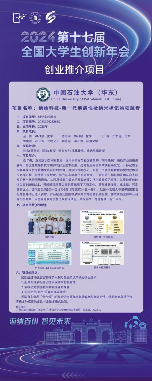 近日,第十七届全国大学生创新年会在四川大学举行。我院2021级本科生金典负责,曾景斌老师指导的《纳检科技-新一代疾病快检纳米标记物领航者》入围年会进行展示交流(全校共5项)。