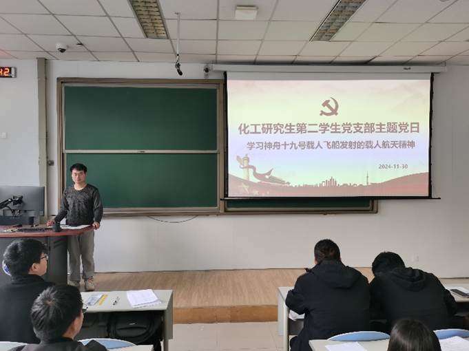 2024年10月30日4时27分,神舟十九号载人飞船搭载长征二号F遥十九运载火箭在酒泉卫星发射中心成功发射升空。为深入学习感受“特别能吃苦、特别能战斗、特别能攻关、特别能奉献”的载人航天精神,从中国航天人身上汲取“敢于拼搏、探索创新、无私奉献”的奋进力量,2024年11月30日,化工研究生第二学生党支部在讲堂群南堂116教室组织召开十一月主题党日活动,会议由支部书记王长运主持,支部全体党员及部分积极分子参会。