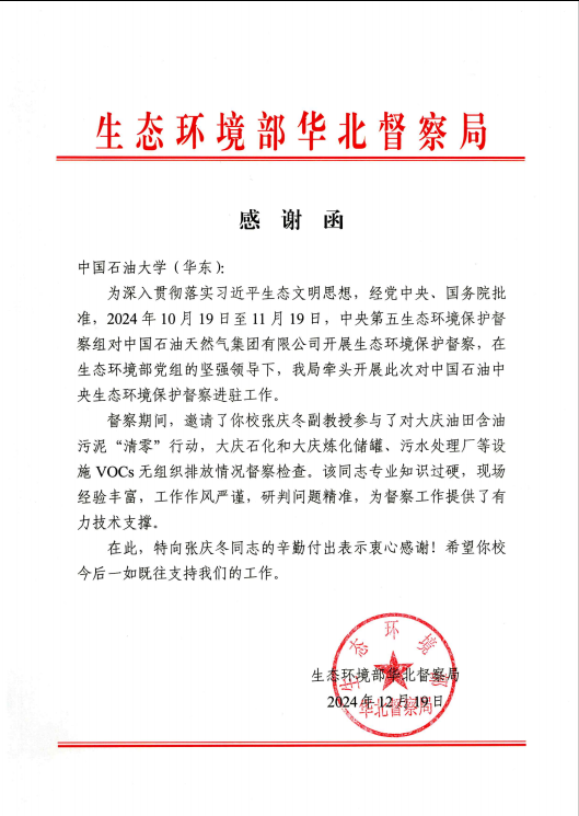 近日,学校收到生态环境部华北督察局发来的感谢信,对我院教师张庆冬助力中央第五生态环境保护督察组对中国石油天然气集团有限公司开展的生态环境保护督察工作予以高度评价,对学院的大力支持表示真挚的感谢。