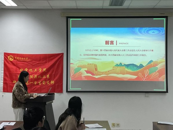 为促进全体党员深入学习贯彻两会精神,将两会精神转化为实际行动,立足本职岗位,勇于担当作为,3月12日,生物与能源化工系研究生第一学生党支部于逸夫楼340开展组织生活。本次组织生活由党支部书记程一凤同志带领深入学习2025年全国两会精神。