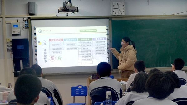 2025年1月20日,能化2102班王胜杰前往安徽省宿州市灵璧县第一中学开展国家学生资助政策、学校学生资助政策的宣传。他介绍了本科生教育阶段国家的资助政策——国家奖学金、国家励志奖学金、国家助学金、国家助学贷款及太阳成集团tyc33455cc的“奖、助、贷、勤、补、减、免、偿、险”九位一体资助体系。随后,他通过生动的案例和数据让高三学子对资助政策有了更深刻的理解。在交流环节,王胜杰以自己的学习和研究经验,为高三备考的学弟学妹们解答疑问,提供了实用的建议和指导。此次宣讲活动也受到了当地老师们和同学们的一致好评。