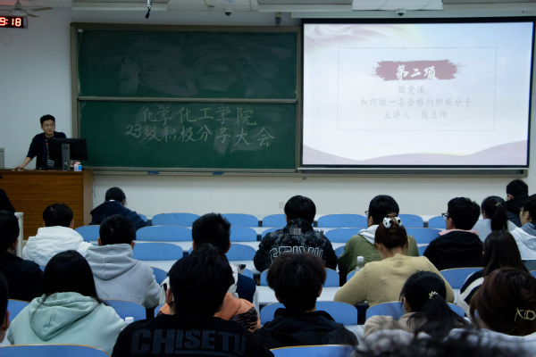 为帮助入党积极分子端正思想,端正担当有为的工作作风,更好发挥模范带头作用,学院2023级本科生于3月20日晚,在南教201召开了入党积极分子教育大会。会议由年级学生党建工作负责人潘浩主持,学院党委副书记徐光辉出席,23级辅导员钱立坤,兼职辅导员马胜祥、李文轩和全体入党积极分子参会。