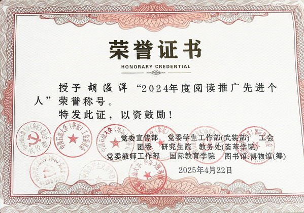 在大学校园这片充满希望与活力的知识沃土上,阅读恰似点点繁星,照亮学子们探索未知的漫漫征途;而阅读推广人,则宛如那穿梭于星辰之间的使者,以热情为笔,绘就着校园浓厚的书香画卷。今天,我们一起走进“2024年度阅读推广先进个人”胡溢洋的书香世界,探寻他在阅读推广旅程中的点点滴滴。