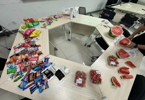 活动场地经过精心布置,右侧靠墙的长桌上整齐摆放着各式各样的零食和饮料,从薯片、糖果到饼干、水果应有尽有,还准备了可乐、果汁等饮品,成为成员们随时补充能量的“加油站”。不少成员围坐在茶歇区,一边享用美食,一边聊天说笑,轻松的氛围让大家很快拉近了距离。