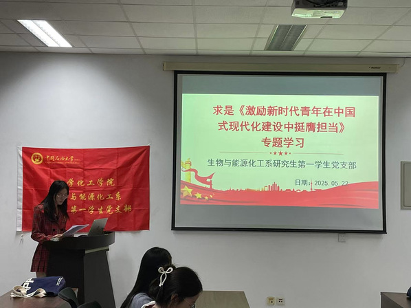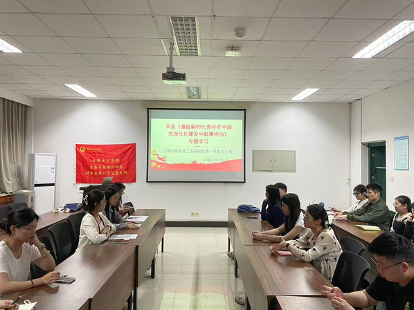 5月22日,生物与能源化工系研究生第一学生党支部于逸夫楼340开展组织生活,本次组织生活由党支部书记程一凤主持;党支部组织委员夏晓静同志带领全体党员同志学习习近平总书记在上海考察时期发表在《求是》上的《激励新时代青年在中国式现代化建设中挺膺担当》的文章。