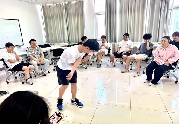 作为分组“枢纽”的“口香糖粘哪里”游戏,以趣味肢体互动完成了队伍划分。从个人挑战的“左手粘左脚底”到双人协作的“两只右手粘在一起”,再到团体任务的“5人右手粘成圈”,同学们在心理委员的指令中不断调整站位,笑声此起彼伏。场地互动环节“后背粘在草地上”的加入,更让大家因地制宜发挥创意。最终形成的4支队伍带着这份默契,迅速投入到“超音速传话”的挑战中。从“小白兔”“恐龙”等动物形象,到“狼吞虎咽”“狗急跳墙”等成语演绎,再到“抱头痛哭”“愁眉苦脸”的情绪传递,各组通过夸张的肢体语言、默契的细节配合,在限定时间内完成信息接力。尽管部分队伍因“传递变形”需模仿动物叫声,但全员始终以鼓励的掌声为彼此加油,将“重在参与”的团辅精神展现得淋漓尽致。