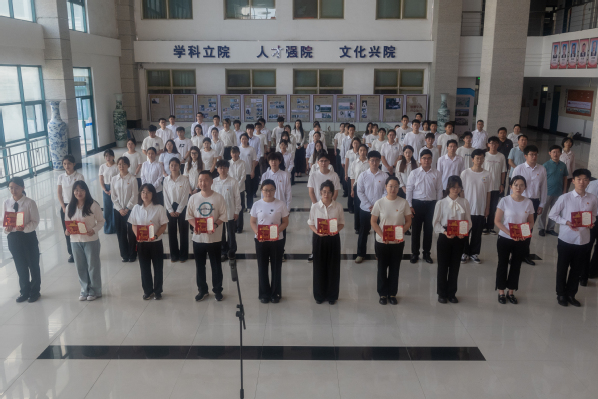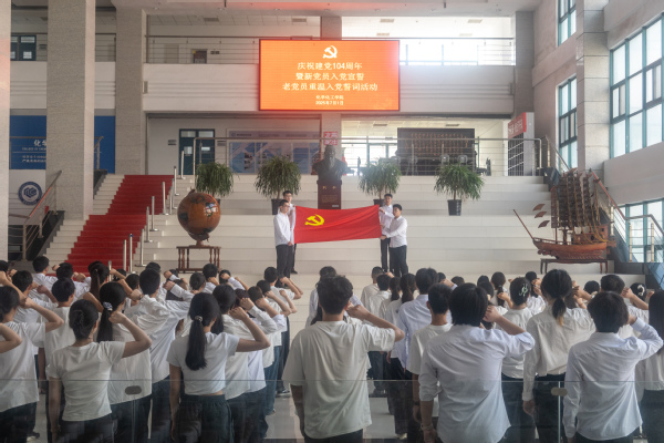 为热烈庆祝中国共产党成立104周年,坚定党员理想信念,7月1日上午,太阳成集团tyc33455隆重举行庆祝中国共产党成立104周年暨新党员宣誓、老党员重温入党誓词活动。学院党委书记张永宁、党委副书记徐光辉以及教工党支部书记、辅导员和学生党员代表齐聚一堂,共同见证98名新党员加入党组织、85名预备党员转正的重要时刻。活动在唐岛湾校区和古镇口校区同时进行。