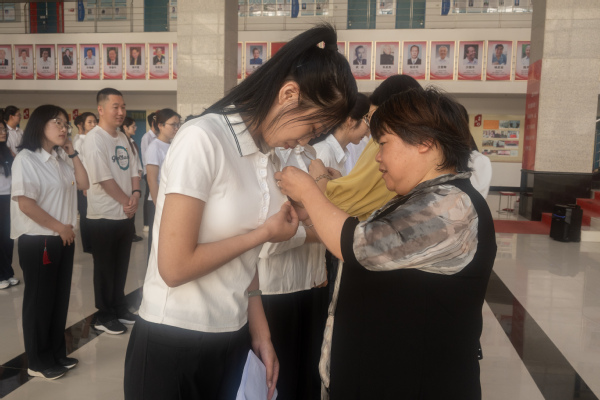 教工党员代表为新转正学生党员佩戴党徽 柳伟摄影