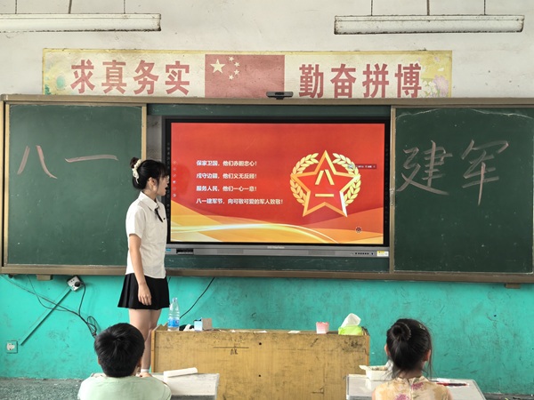 随后,支教队员们为孩子们播放了革命历史题材电影《建军大业》。当银幕上出现南昌起义的激烈战斗场面、战士们冒着枪林弹雨冲锋陷阵的镜头时,原本喧闹的教室瞬间安静下来,孩子们紧盯着画面,不少人眼中泛起了泪光。电影中,周恩来、贺龙、叶挺等革命先辈为了理想信念浴血奋战的场景,让孩子们深受震撼。