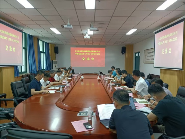 8月12日,石大胜华新材料集团股份有限公司董事长郭天明、总经理于海明、石大胜华先进能源材料研究院院长陈勇等一行8人到访学院,就校企合作、成果转化开展交流。本次会议由院长刘欣梅主持,副院长胡涵、金鑫、党委副书记徐光辉、重质油全国重点实验室主任田原宇等参会交流。
