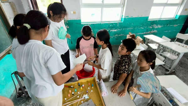 示范结束后,孩子们迫不及待地开始了自己的创作之旅。他们纷纷挑选自己喜欢的颜色,按照杨昊老师所教的方法,认真地进行漆扇制作。在制作过程中,孩子们充分发挥自己的想象力和创造力,有的孩子将多种颜色的漆料巧妙搭配,制作出色彩斑斓的扇面;有的孩子则专注于创造独特的纹理,展现出对细节的追求。遇到问题时,他们会主动向杨昊老师和支教队的其他成员请教,现场洋溢着浓厚的学习氛围。