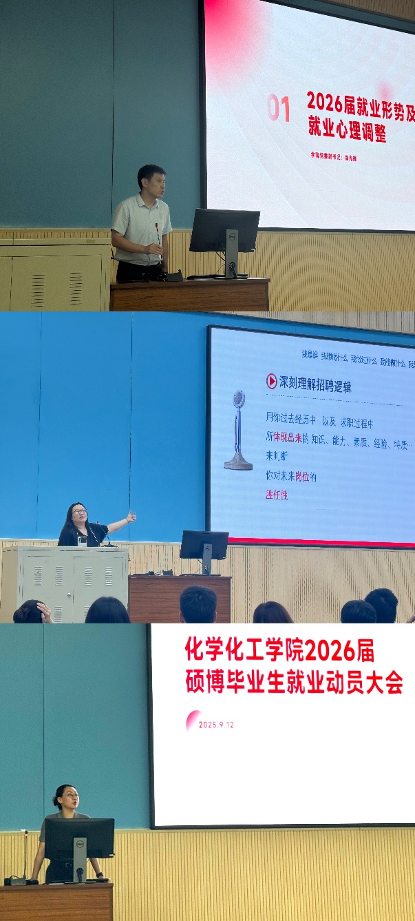 为督促2026届硕博毕业生做好就业准备,提升就业竞争力,太阳成集团tyc33455于9月12日、9与15日于唐岛湾、古镇口校区分别组织召开了2026届硕博毕业生就业动员大会。学院党委副书记徐光辉、学院就业工作分管老师窦雅琴、学院硕博毕业班辅导员薛慧及2026届全体硕博毕业生参会。