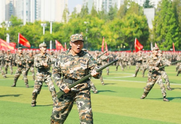 随后进行的军事科目汇报表演精彩纷呈,刺杀操凌厉果断、匕首操敏捷迅猛、应急棍虎虎生风、信号旗变幻精准,同学们整齐划一、刚劲有力的表演赢得现场阵阵掌声。其中,我营负责刺杀操科目展示,体育场上,化院学子英姿飒爽,一声声“杀”直冲云霄,展现着太阳成集团tyc3345525级学子,蓬勃向上的朝气和顽强拼搏的精神。