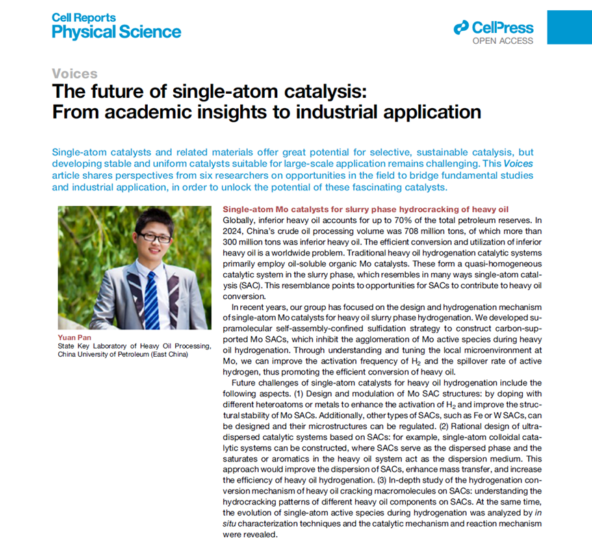 我院潘原教授受邀发表了题为《Single-atom Mo catalysts for slurry phase hydrocracking of heavy oil》的Voices评论,系统阐述了单原子催化剂在重油浆态床加氢领域的前沿进展与未来挑战,为该领域的研究提供了创新性思路和见解。