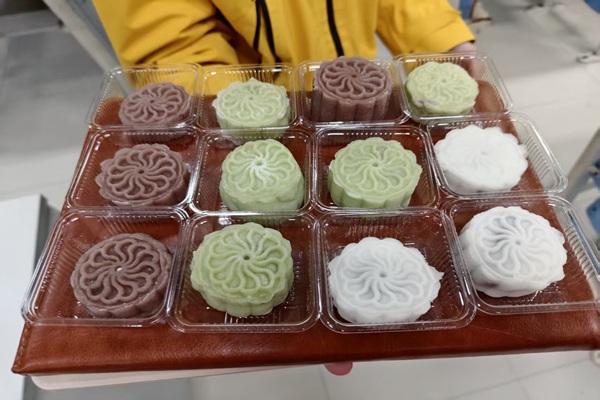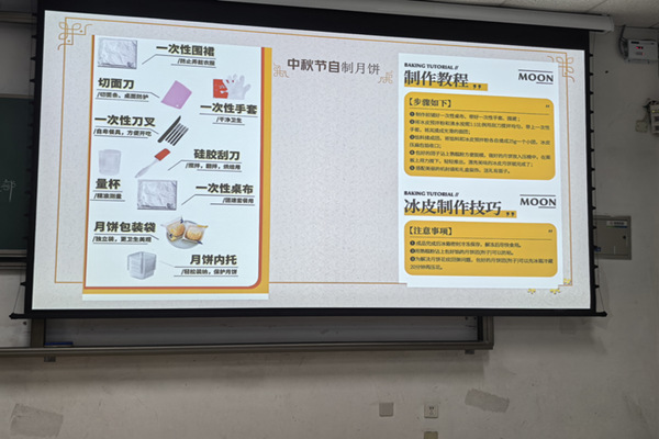 最具挑战性的当属包馅与压制阶段。如何将香甜的馅料完美地包裹进薄厚均匀的皮中,且不留缝隙,成了摆在大家面前的共同难题。然而,在一次次失败与摸索中,各组团员互帮互助,默契配合:有的负责掌控皮馅比例,有的专精于收口技巧,有的则稳稳操持模具。当第一个花纹清晰、形态饱满的冰皮月饼成功脱模时,整个小组都爆发出了成功的欢呼。空气中弥漫着糕点的甜香,活动现场充满了青春的活力与合作的暖意。