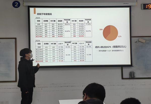 11月7日,化工2306班在综合楼A415召开主题班会。此次班会由班主任祝晓琳主持,全体同学参与。班会聚焦综测复盘与发展规划,解决班级现存问题。本次班会分为两个部分。首先,班长陈凯尊介绍班级现阶段基本情况。通过对比班级两个学年综测数据,陈凯尊指出班级综测平均分下降,实践创新模块参与率不足,部分学生对综测体系理解片面等问题。同时公布班级发展意向调研:60%学生计划考研,关注备考与院校选择;40%倾向就业,聚焦职业定位与技能提升。