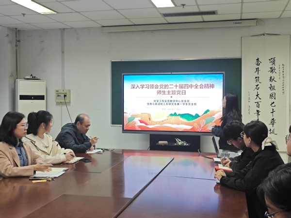 党的二十届四中全会顺利闭幕后,学习贯彻全会精神成为全党全国的重大政治任务。为切实把思想和行动统一到党中央决策部署上来,化学工程实验教学中心党支部联合生物与能源化工系研究生第一学生党支部,于11月6日下午在工科A335召开学习党的二十届四中全会精神专题会议。本次会议由教工党支部书记张淑霞同志主持,聚焦“深入学习领会党的二十届四中全会精神”主题,议程涵盖全会精神领学、师生代表发言、交流研讨及总结部署四个环节。