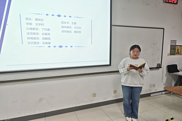 在会议的最后一部分,化工2503的班委齐上阵,分享自身对于班级建设以及自身工作计划的想法。其中班长满芙彤围绕“衔接师生、夯实学风”这一主题,提出了班级学业帮扶与学风建设的建议,并计划以后通过信息梳理、主题班会、调研反馈等举措,联动班委推进班级事务,助力营造积极集体氛围。