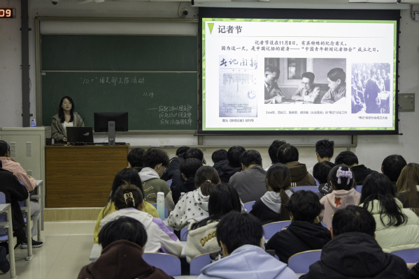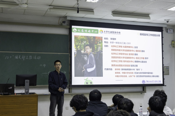 2025年11月15日,应用化学2501团支部、应用化学2503班团支部于南教114联合开展融媒体宣传主题宣讲。活动特邀化大学生融媒体中心摄影部部长张楚林和新媒体编辑部部长助理石仓旭主讲,旨在夯实青年宣传思想工作基础,提升新闻宣传专业能力,筑牢校园主流舆论阵地。