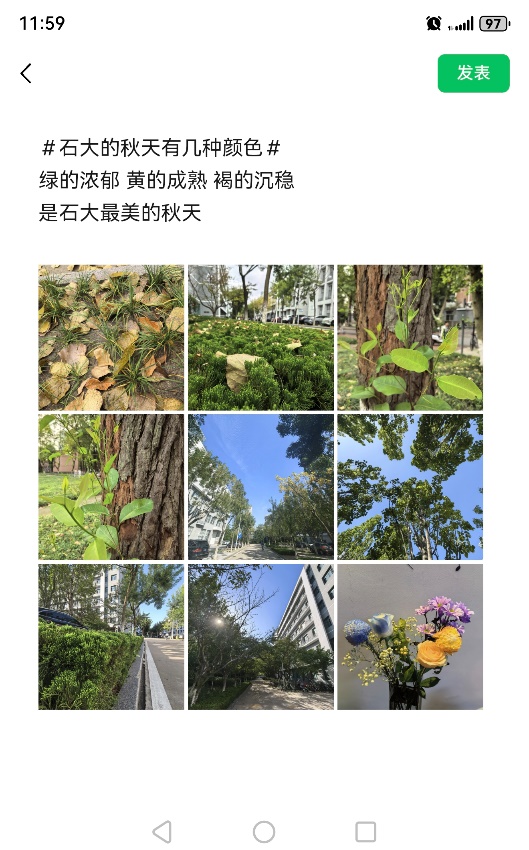 请参赛同学将作品以#石大的秋天有几种颜色#为话题标签在微信朋友圈或QQ空间以四宫格或九宫格形式发布后(发布范例见下图),将朋友圈/QQ空间截图+照片原图+配文,以“研究生秋日摄影征集+姓名”为邮件主题,发送至指定邮箱:1598958732@qq.com。