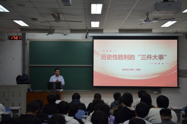王鹏翔老师讲解三个胜利 冯涛摄活动伊始,王鹏翔以“人生大事” 为切入点开始演讲,幽默地询问大家心中的重要目标。现场氛围轻松热烈。王鹏翔顺势引出:“对个人而言,这些是人生大事;对中国共产党和国家来说,近十年也完成了三件影响深远的大事。” 随后清晰阐释了 “迎来中国共产党一百周年诞辰、中国特色社会主义进入新时代、完成脱贫攻坚全面建成小康社会实现第一个百年奋斗目标” 的核心内涵,直观感受到个人发展与国家命运的紧密联系。