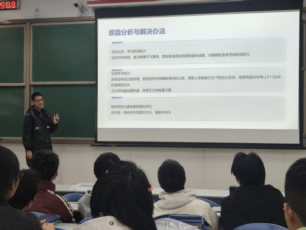 班会伊始,心理委员通过生动有趣的课件和互动讨论,从书写理想盲盒到讲述安全规则,一步步引导新生深刻认识到从“高中生”到“大学生”角色转变的重要性。心理委员还通过播放警示教育片、讲解典型案例等方式,对网络安全、防范电信诈骗进行了全面而细致的普及。此外,他鼓励新生要立大志、明大德,尽快树立远大理想,将个人发展融入时代洪流,带着彼此的期待和郑重的承诺,科学规划大学生涯,以饱满的精神状态开启人生新篇章。