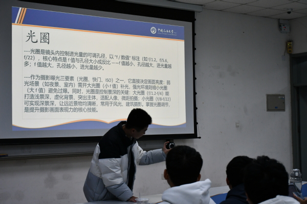 谷兆哲围绕摄影曝光三要素展开讲解,详细阐述光圈、快门、ISO的参数调节逻辑,结合校园活动场景举例说明大光圈虚化背景、高速快门定格动态等实用技巧,并实际进去操作演示。随后,他通过案例演示横屏构图、黄金比例构图等方法,强调宣传照片需满足光线充足、人物表情自然、无不良动作等要求,单活动配图控制在2-4张高质量图片。