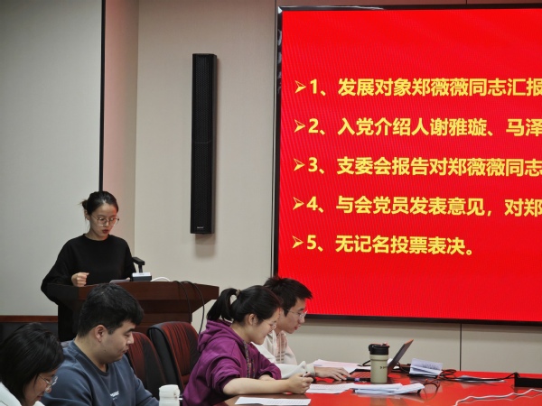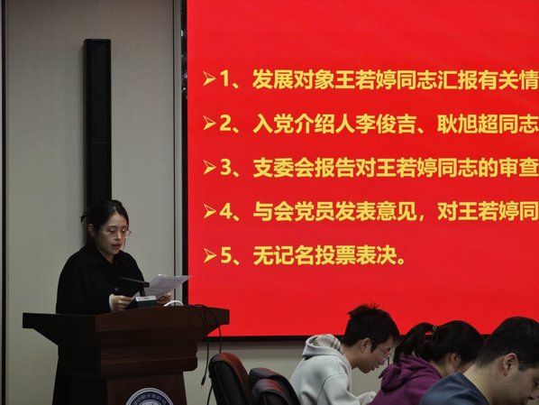 2025年11月28日下午,多孔材料工程与应用课题组学生党支部在古镇口校区国重楼504会议室召开了讨论接收预备党员支部大会。会议由支部书记李俊吉主持,应到会有表决权党员47人,实到有表决权党员34人,超过本支部有表决权党员半数以上,符合规定人数,可以开会。