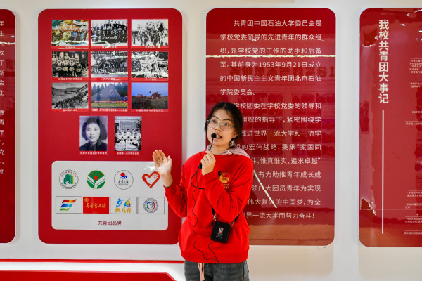 活动伊始,展厅讲解员以展板内容为依托,系统讲解共青团的发展历程:从中国共产主义青年团的成立初心,到中国石油大学共青团的前身——1953年9月21日成立的中国新民主主义青年团北京石油学院委员会,再到学校团委“家国同心、艰苦奋斗、惟真惟实、追求卓越”的工作理念。讲解中,讲解员重点解读了“石大共青团大事记”板块,梳理学校团委在组织建设、思想引领、青年服务等方面的关键节点,让成员们直观感知校团委与青年共成长的历程。