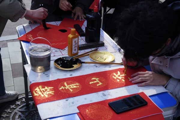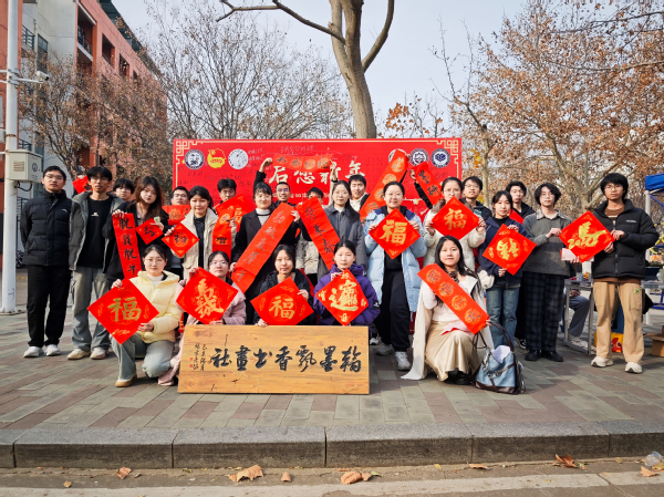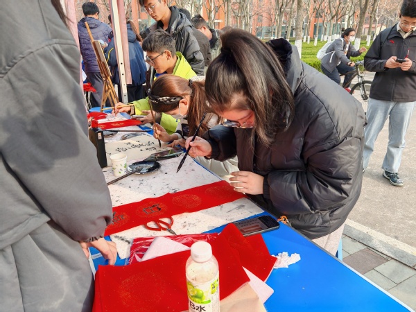 活动当日,社团的同学们提前布置好场地,备好笔墨纸砚,现场书写春联与“福”字。一副副寓意吉祥的春联在笔端呈现,吸引了众多师生驻足。大家或静静观摩书写过程,或挑选心仪的联句,也有不少师生排队等候定制个人专属春联。茶艺社准备了温热的茶水,为参加活动的师生以及校园工作人员送上暖茶,驱散冬日的寒意,现场气氛温馨热烈。