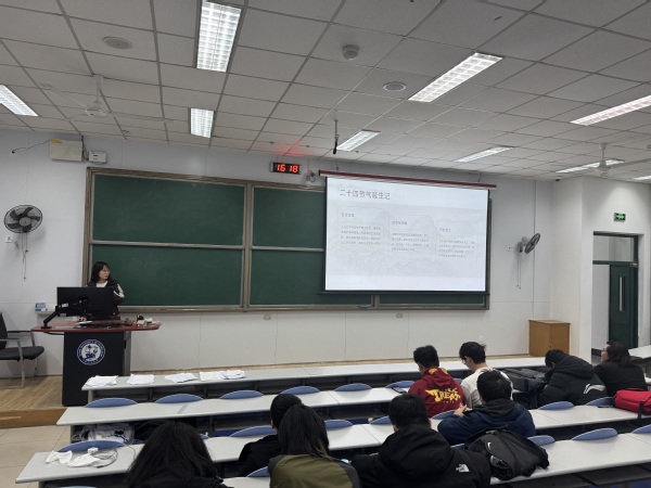活动伊始,主讲同学以“二十四节气诞生记”为切入点,生动梳理了这一传统历法从古代农耕生产需求中衍生的历史脉络,深入解析节气与自然物候、农事活动之间的紧密关联,让同学们清晰把握节气文化的起源与实用价值。随后,分享聚焦“补冬药罐玄机”,结合冬日各节气的气候特征,细致讲解了对应的养生习俗,如冬至进补、小寒御寒等,并挖掘背后蕴含的“顺时养生”文化内涵。搭配着满含山水意境的PPT画面,传统文化讲解更添沉浸感,现场同学纷纷提笔记录要点,学习热情十分高涨。