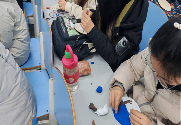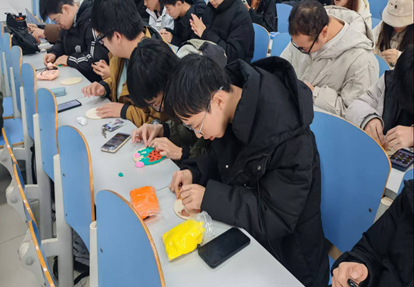随后的动手实践环节成为活动的亮点。团员们以太空泥为创作媒介,在圆木板上围绕二十四节气的自然景象、民俗活动与特色美食展开创意创作。指尖翻飞间,春分的纸鸢摇曳升空,端午的粽子饱满鲜香,霜降的枫叶红似烈火,冬至的汤圆圆润软糯,还有处暑的荷花、小寒的梅花等作品栩栩如生。大家自由发挥想象,有的结合团队创意,合作完成“二十四节气轮回”主题拼盘。创作完成后,团员纷纷积极分享作品背后的设计思路,从节气习俗的理解到创作灵感的来源,在交流中进一步解锁了节气文化的深层内涵。