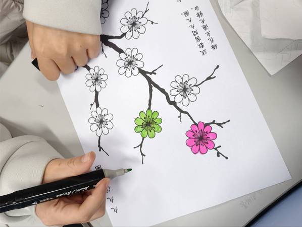 在最受期待的制作环节,成员们纷纷拿起画笔、彩纸,发挥创意构思属于自己的九九消寒图。有的以“素梅一枝”为蓝本,勾勒出九朵待放的梅花;有的选择“亭前垂柳珍重待春风”九字,精心设计书法字体;还有的融合现代审美,在传统图案中加入创意元素。一笔一划间,大家不仅掌握了消寒图的制作技巧,更在动手实践中体会到传统文化的趣味与温度。活动现场氛围热烈,成员们相互交流创作心得,分享冬至习俗故事,其乐融融。