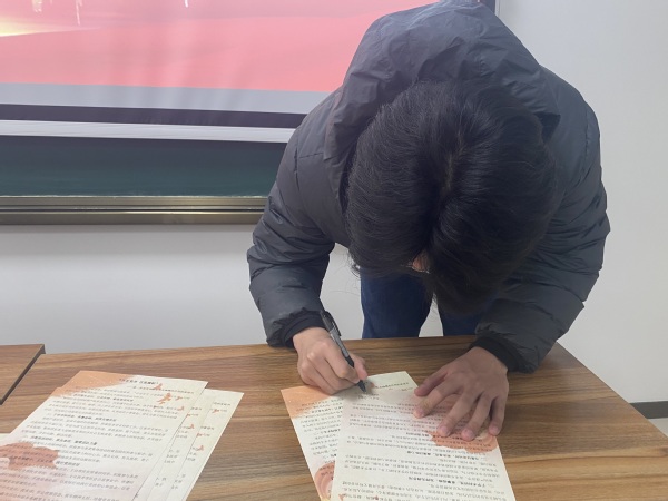 签订承诺书前,甄玉杰、姜潇和刘在伟向各班级党员们介绍活动的目标和意义。一名党员,就是一面旗帜;一句承诺,就是一份责任;一份责任就是一种践行。作为学生党员,就要将党员身份亮出来,将党员承诺说出来,推行党员承诺是保持学生党员先进性制度化和常态化的重要措施,是发挥先锋模范带头作用的有效保障,更是接受所有人的监督、提升自我的必然选择,每一名党员都要兑现自己的承诺,以实际行动带领同学们共同进步。