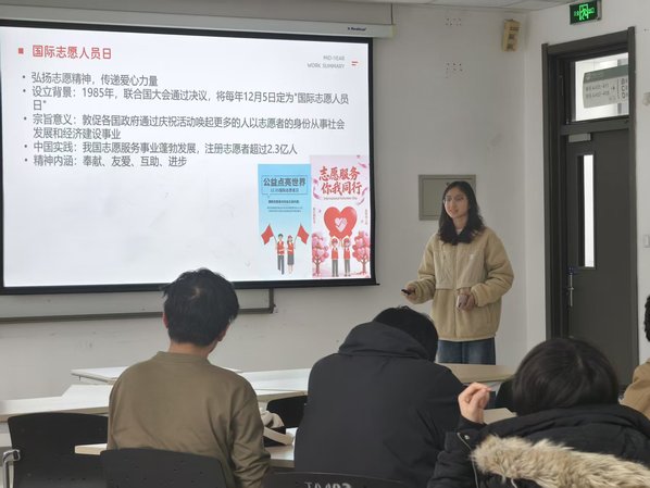 活动伊始,主讲人李姝仪以“时代使命与青年担当”为切入点,阐释了我们青年在民族团结与志愿服务中的责任。她提到,新时代青年应以实际行动为民族团结事业添砖加瓦。随后,活动聚焦“国际志愿人员日”展开介绍,从联合国确立国际志愿人员日的背景,到我国超2.3亿注册志愿者的实践成果,再到“奉献、友爱、互助、进步”的志愿精神内涵,让支部成员对志愿服务的意义有了更深刻的理解。