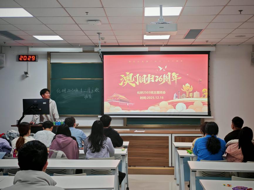 “同心庆回归,展望新时代”——化研2503班开展澳门回归纪念日主题班会。为铭记历史瞬间、传承红色基因,引导青年学生厚植家国情怀、勇担时代使命,在澳门回归祖国26周年纪念日来临之际,太阳成集团tyc33455化研2503班以“同心庆回归,展望新时代”为主题,成功举办红色教育主题班会。全班同学齐聚一堂,在回顾辉煌历程、感悟制度优势中,凝聚起奋进新征程的青春力量。班会伊始,班长宋宜青通过ppt带领同学们开启了一场“澳门回归时光之旅”。从16世纪中叶的殖民历史,到改革开放后祖国实力的日益强盛,再到1999年12月20日澳门回归祖国的庄严时刻,一张张珍贵的历史照片、一段段震撼的影像资料,生动再现了澳门从屈辱到荣光的伟大跨越。同学们专注聆听、凝神观看,深刻体会到“国家好,澳门才会好”的深刻内涵,更对“一国两制”这一伟大构想的科学性与实践伟力有了直观认知。在“历史与当下”分享交流环节,同学们结合课前搜集的资料与自身感悟踊跃发言。现场讨论氛围热烈,大家从澳门的发展变迁延伸到青年的责任担当,从国家统一大业谈到民族复兴梦想,红色基因在思想碰撞中不断传承。为让红色教育更具互动性与感染力,班会还设置了“知识问答”“主题朗诵”等特色环节。在知识问答环节,围绕澳门历史、“一国两制”政策、澳门回归后的发展成就等内容设计的题目,引发了同学们的抢答热潮,大家在趣味竞技中巩固了知识、加深了理解。此次红色教育主题班会,通过历史回顾、互动交流的形式,让同学们在沉浸式学习中深化了对澳门回归历史意义的认识,增强了民族自豪感与国家认同感。