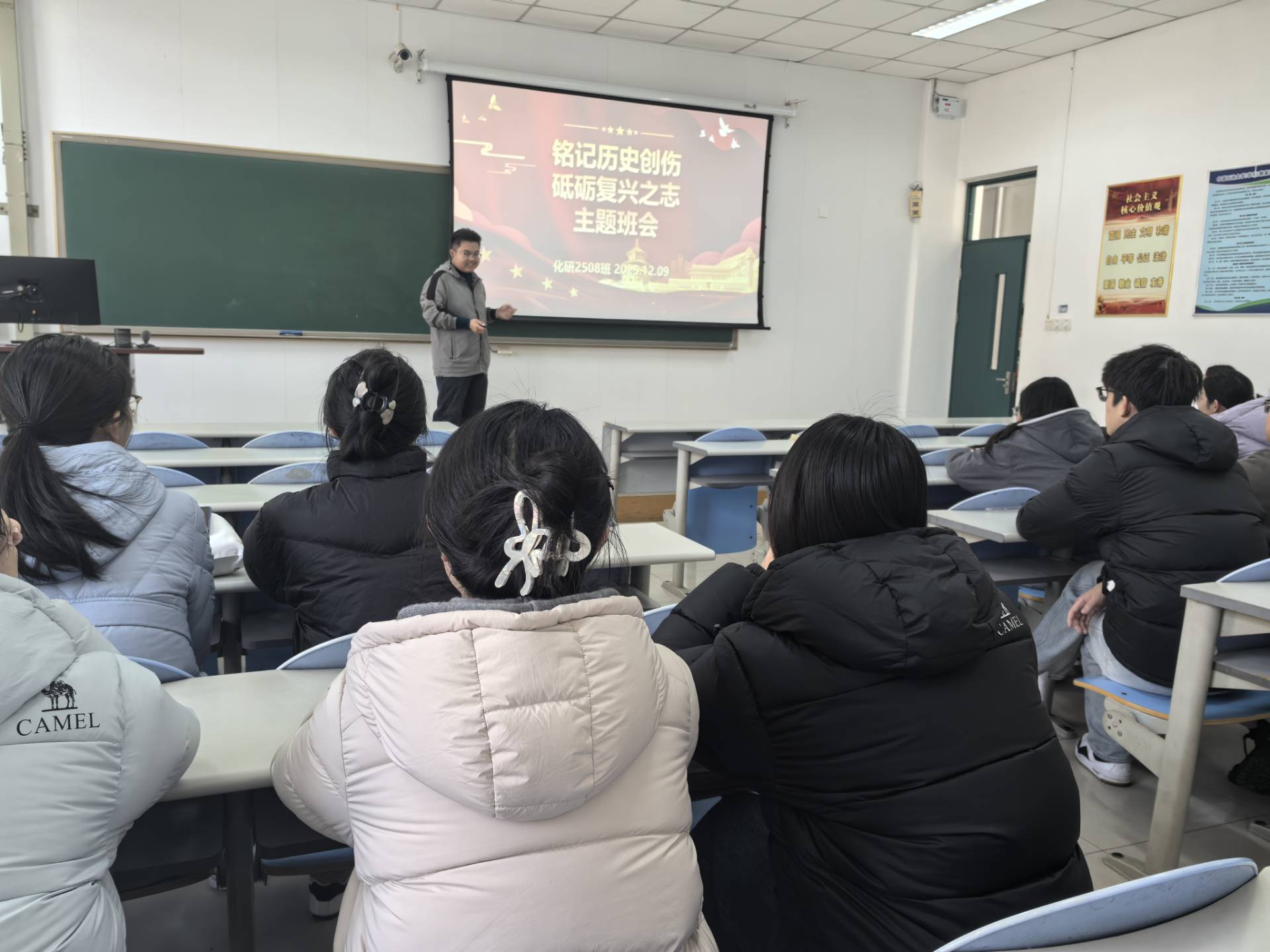 化研2508班爱国主义教育主题班会成功召开。为深刻铭记民族历史,激发青春报国之志,12月9日下午,化研2508班于南堂202教室成功举办了“铭记历史创伤,砥砺复兴之志”爱国主义教育主题班会。会上,同学们通过观看精选的历史纪录片片段,共同回顾了那段筚路蓝缕、饱经风霜的岁月。在随后的分享与讨论环节,大家结合所学所思,踊跃发言。有的同学谈到历史留下的深刻启示,有的则联系当今时代发展,阐述青年一代的责任。此次班会不仅是一次深刻的历史教育,更是一堂生动的理想信念课。它让我们在触摸历史脉络的同时,更加明确了肩上的重任。大家一致表示,将从历史中汲取前行力量,把个人成长融入时代洪流,以扎实的学习和实际的行动,践行“请党放心,强国有我”的青春誓言,共同书写无愧于时代的崭新篇章。
