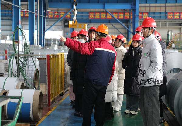 实践期间,企业技术负责人在对学生进行安全培训后,带领学生走入生产车间。在车间中,技术负责人介绍到,企业建立智能互联工厂平台,将现场生产数据快速对接,并自动计算加工量、销售量。通过与海尔新能源合作建立光伏能源储能,将能源利用数据更加智能化地管理。车间中,各区域分工明确,共有11条产线,园区经青岛市评定为青岛钢链智能制造产业园,拥有全品种钢材加工定制能力;产品从家电钢板、到汽车门板、精细钢材均有涉及,全产线具有高度自动化、智能化的特点。