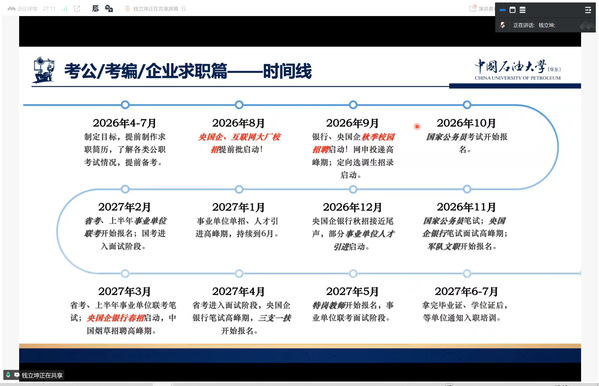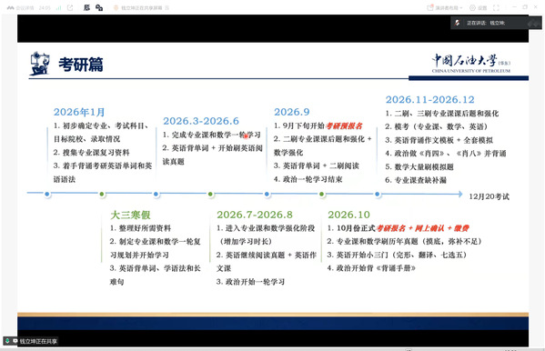 钱立坤围绕同学们最为关心的升学与就业问题展开详细指导。在保研规划中,钱立坤梳理了保研的全流程关键时间节点,提醒同学们早做准备。针对考研规划,结合2026年考研时间线,建议同学们寒假调整好心态,合理规划好合适时间复习备考。在考公与求职板块,详细讲解了从招聘到入职的完整时间轴,鼓励同学们提前制作简历、关注招考信息。