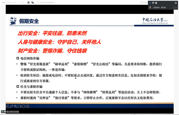 会议后半程,安全成为核心议题。钱立坤重点强调了电信诈骗的防范要点,详细解析“冒充客服退款”“刷单返利”等常见骗局,希望同学们寒假提高反诈意识,保护自身财产安全。同时就出行安全和人身健康安全作出提醒,要求同学们离校前切断宿舍电源、假期保持通讯畅通,合理规划假期生活,在放松休息的同时提升自我。