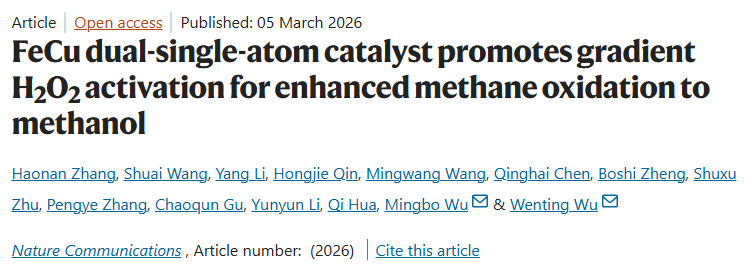 (1) Haonan Zhang, Shuai Wang, Yang Li, Hongjie Qin, Mingwang Wang, Qinghai Chen, Boshi Zheng, Shuxu Zhu, Pengye Zhang, Chaoqun Gu, Yunyun Li, Qi Hua, Mingbo Wu*, Wenting Wu*.FeCu Dual-Single-Atom Catalyst Promotes Gradient H2O2 Activation for Enhanced Methane Oxidation to Methanol. Nature communications 2026, 10.1038/s41467-026-70179-8.