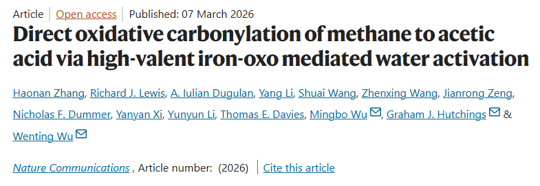 (2) Haonan Zhang, Richard J. Lewis, A. Iulian Dugulan, Yang Li, Shuai Wang, Zhenxing Wang, Jianrong Zeng, Nicholas F. Dummer, Yanyan Xi, Yunyun Li, Thomas E. Davies, Mingbo Wu*, Graham J. Hutchings*, Wenting Wu* Direct oxidative carbonylation of methane to acetic acid via high-valent iron-oxo mediated water activation, Nature communications 2026, 10.1038/s41467-026-70339-w