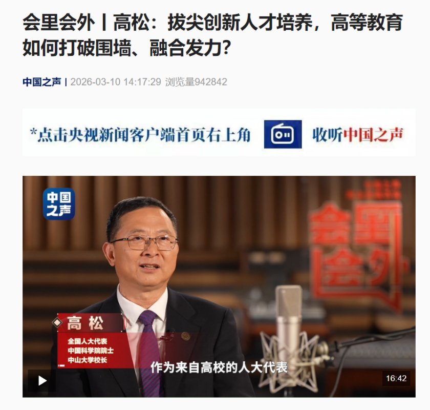 2026年全国两会期间,央视发起两会会外提问相关工作,我院积极对接响应,由马哲老师负责此次央视两会会外提问的专项对接事宜。在此次活动中,我院化学系马哲老师向中山大学校长高松院士提出关于拔尖创新人才培养,高等教育如何打破围墙、融合发力的相关问题,该提问内容已在中央广播电视总台中国之声节目中播出。