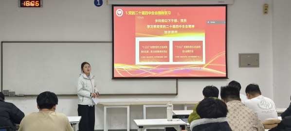会上,支部组织全体党员集中学习党的二十届四中全会精神。围绕“‘十五五’时期经济社会发展的指导思想、重大原则和根本保证”“‘十五五’时期经济社会发展的重大战略任务”等核心内容,党员们深入研读全会公报,结合青年学生党员的身份定位展开交流讨论。大家一致认为,作为学生党员,要自觉把个人成长融入国家发展大局,在专业学习、服务同学、校园建设中担当作为,切实把全会精神转化为奋进新征程的实际行动。