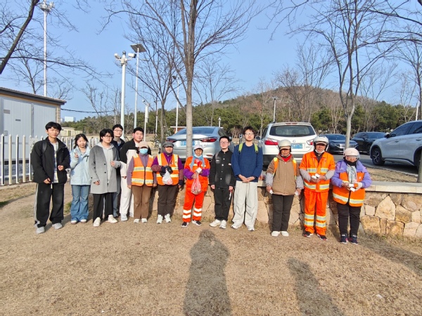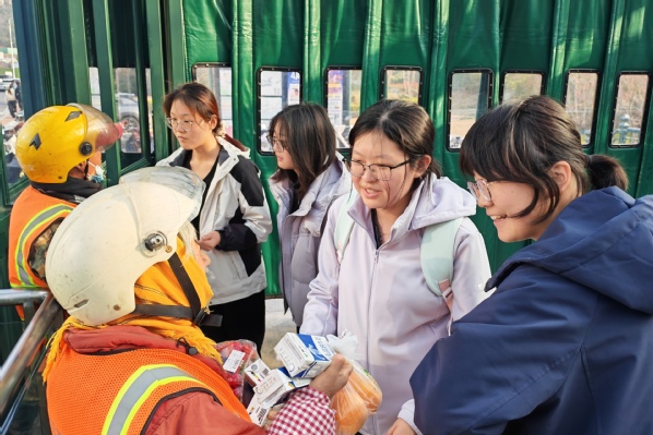 随后,支部将雷锋精神转化为实际行动。支部成员们自行组队,精心准备了水果、牛奶等暖心物资,为花科子山公园周边辛勤工作的环卫工人们送去关怀与问候。大家与“城市美容师”亲切交流,了解他们的工作日常与生活状况,在倾听与对话中增进理解,建立真挚的情感连接,用实际行动表达青年学子的敬意与感恩。活动结束后,各小组与环卫工人合影留念,记录下一个个温暖瞬间。
