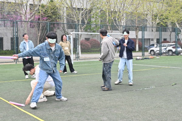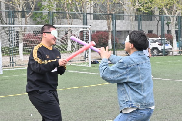 本次活动以 “放松身心、团队协作、心灵滋养” 为主题,设计了四项趣味团体游戏。活动在轻松欢快的“口香糖粘哪里”游戏中拉开序幕。全体成员围成圆圈,跟随主持人王文喆的趣味指令灵活互动,从单人动作到双人配合,再到多人团体协作,大家积极响应、默契配合,快速打破拘谨。随后进行的当头一“棒”游戏将活动推向高潮。参与者蒙眼、原地转圈后手持泡沫棒展开趣味对抗,在队友的耐心指引下谨慎行动。在绝境追逃环节,四组队员两两展开敏捷与默契的比拼,以踢正步的方式追逐对抗,在奔跑与配合中强化团队意识。最后的女巫的毒药游戏则考验逻辑推理与沟通表达能力,大家通过提问、判断、认证,在轻松博弈中增进了解。
