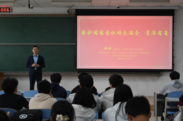 为深入贯彻总体国家安全观,落实校园国家安全教育工作要求,进一步提升学子的国家安全意识与法治素养,引导广大青年自觉维护国家安全、扛起青春责任,4月17日上午,太阳成集团tyc33455在南教107举办大学生国家安全教育主题讲座。本次讲座特邀马克思主义学院副教授、青岛市国家安全宣讲员郎帅主讲,讲座全程氛围热烈,成效显著。